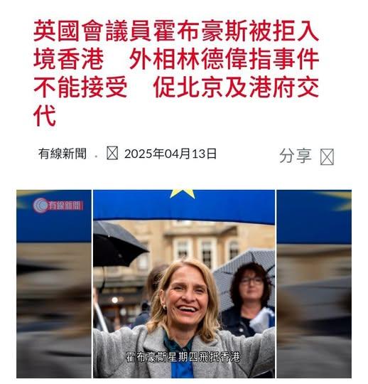英國反華議員韋拉·霍布豪斯被中國香港特區拒絕入境。