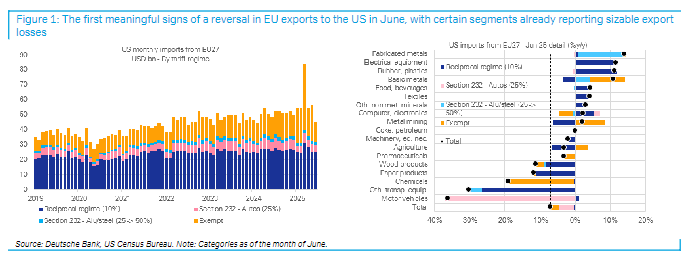 德银在报告中警告称,目前观察到的下降幅度相比模型预测仍然温和,更严重的冲击尚未到来。随着8月7日“对等关税”正式生效,以及“抢出口”效应的消退,欧洲对美出口的下降趋势预计将加速。