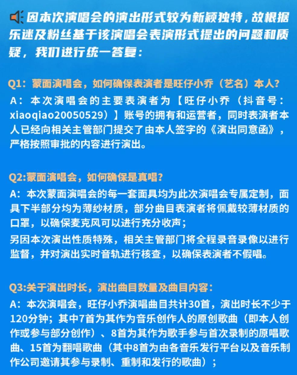 随后,演唱会主办方华纳音乐回应称,此次演唱会,旺仔小乔演唱曲目共计30首,包括7首原创歌曲(本人创作或部分参与创作),8首参与首次录制的原唱歌曲,还有15首翻唱歌曲。