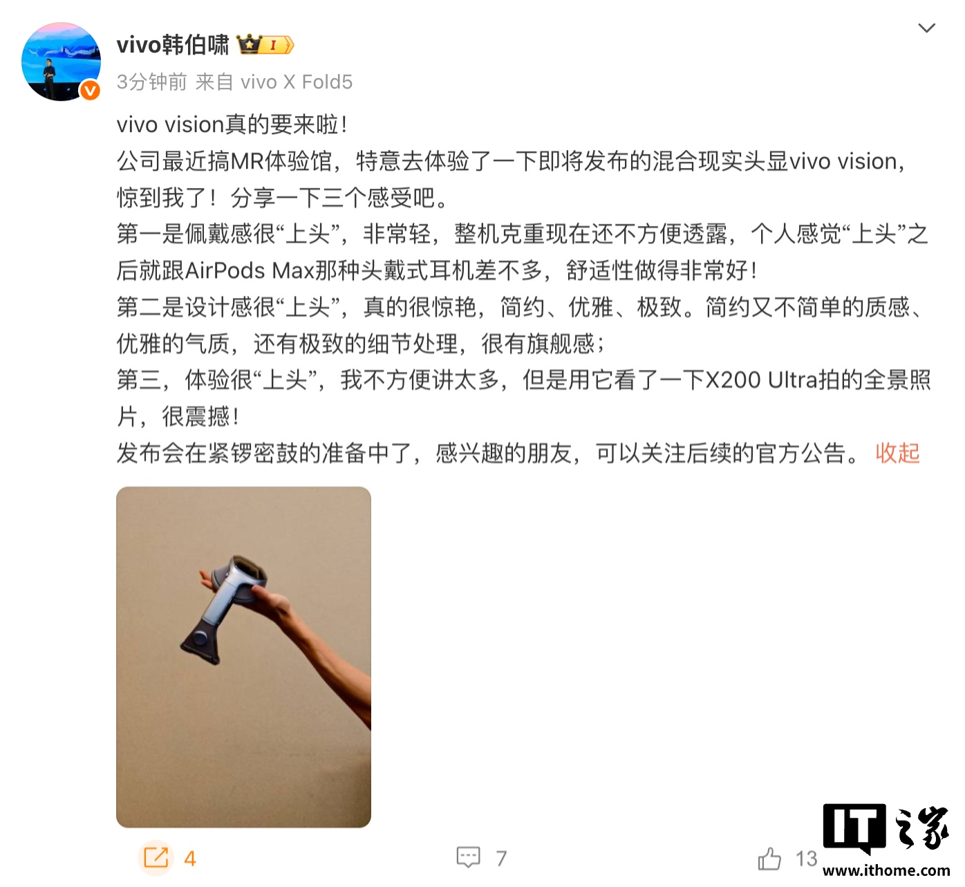IT之家 8 月 11 日消息,今天上午,vivo 通信科技有限公司产品经理 @vivo韩伯啸 发文披露了自己体验 vivo Vision 混合现实头显的使用感受。