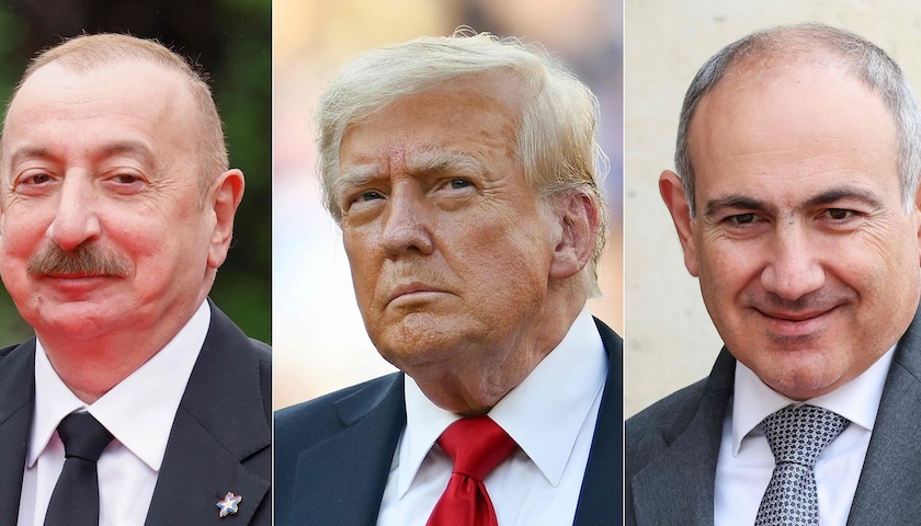 (拼接图)左起:阿塞拜疆总统阿利耶夫、美国总统特朗普、亚美尼亚总理帕希尼扬。来源:视觉中国