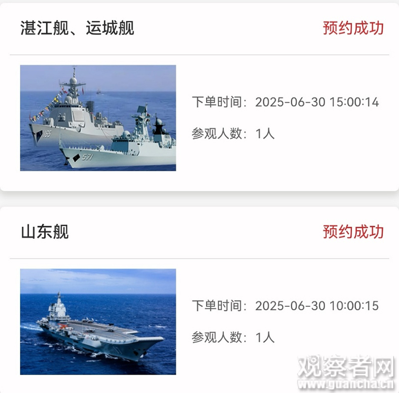这现实情况让我激动的心骤变为焦虑,以至于虽然6月30日10点才开始第一轮抢票,我却在28和29日晚上辗转反侧,只睡了4个小时。直到6月30日10时0分15秒和15时0分14秒我分别成功预约到山东舰和湛江舰、运城舰的参观门票后,我的心情才由焦虑中平复下来,并重新被激动占据。