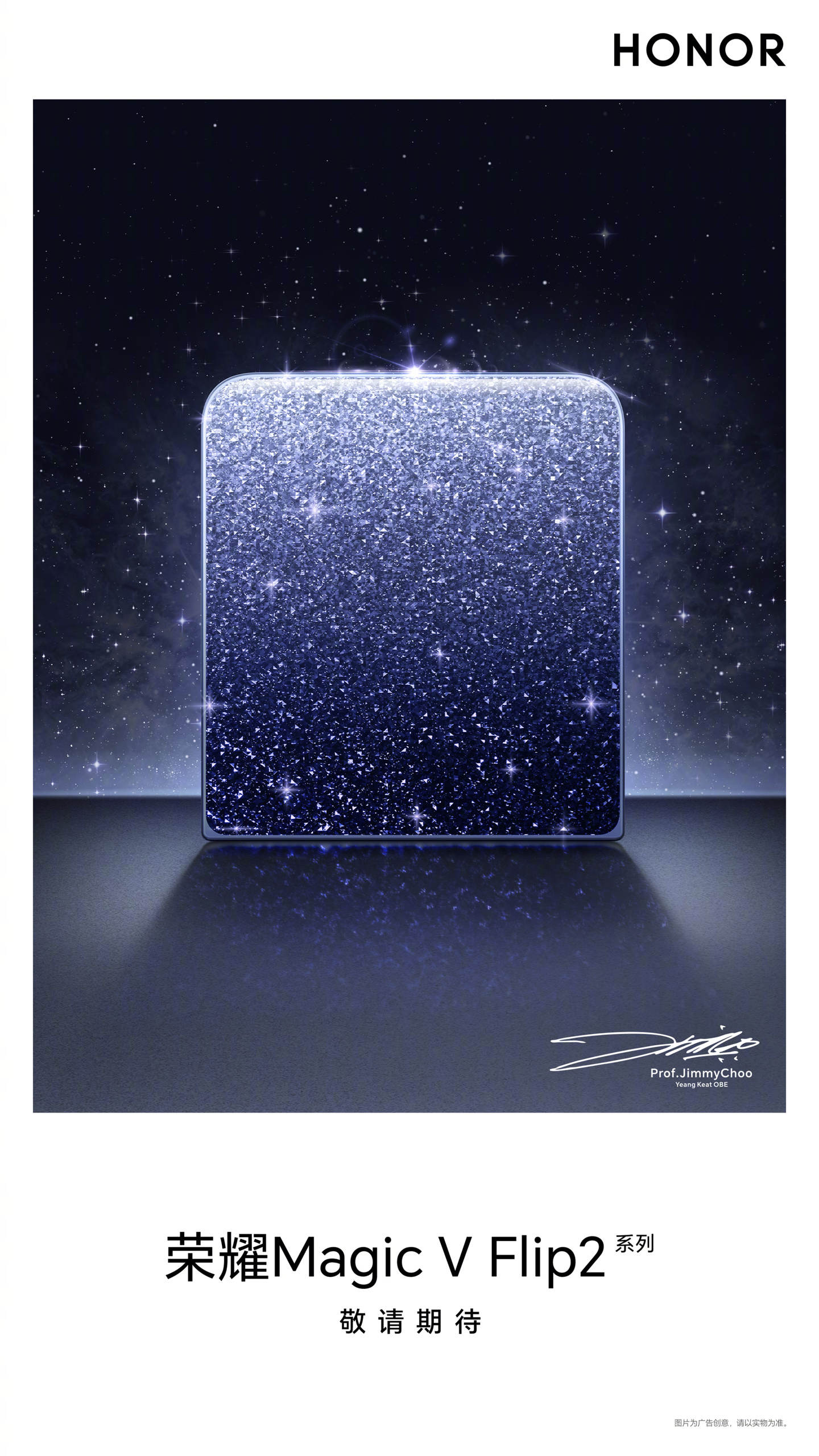 从海报可以看到,荣耀 Magic V Flip2 有望采用类似星空的后盖设计。