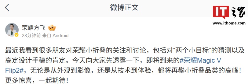 荣耀终端股份有限公司产品线总裁方飞发文称,看到了很多朋友对荣耀小折叠的关注和讨论,包括对“两个小目标”的猜测以及高定设计手稿的肯定。她透露,即将到来的 Magic V Flip2 手机无论是从外观到影像,还是从技术到体验,都将再攀小折叠品类高峰。