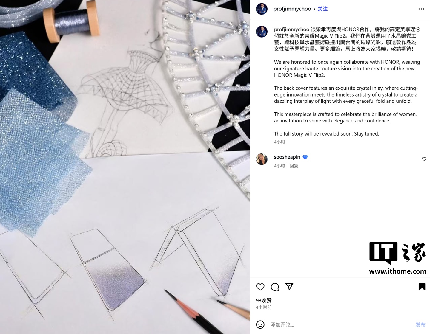 据IT之家昨日报道,奢侈品品牌 Jimmy Choo 的 CEO 周仰杰在社媒 Instagram 表示,已与荣耀再次达成合作,将联手荣耀推出 Magic V Flip2 小折叠手机高定版。