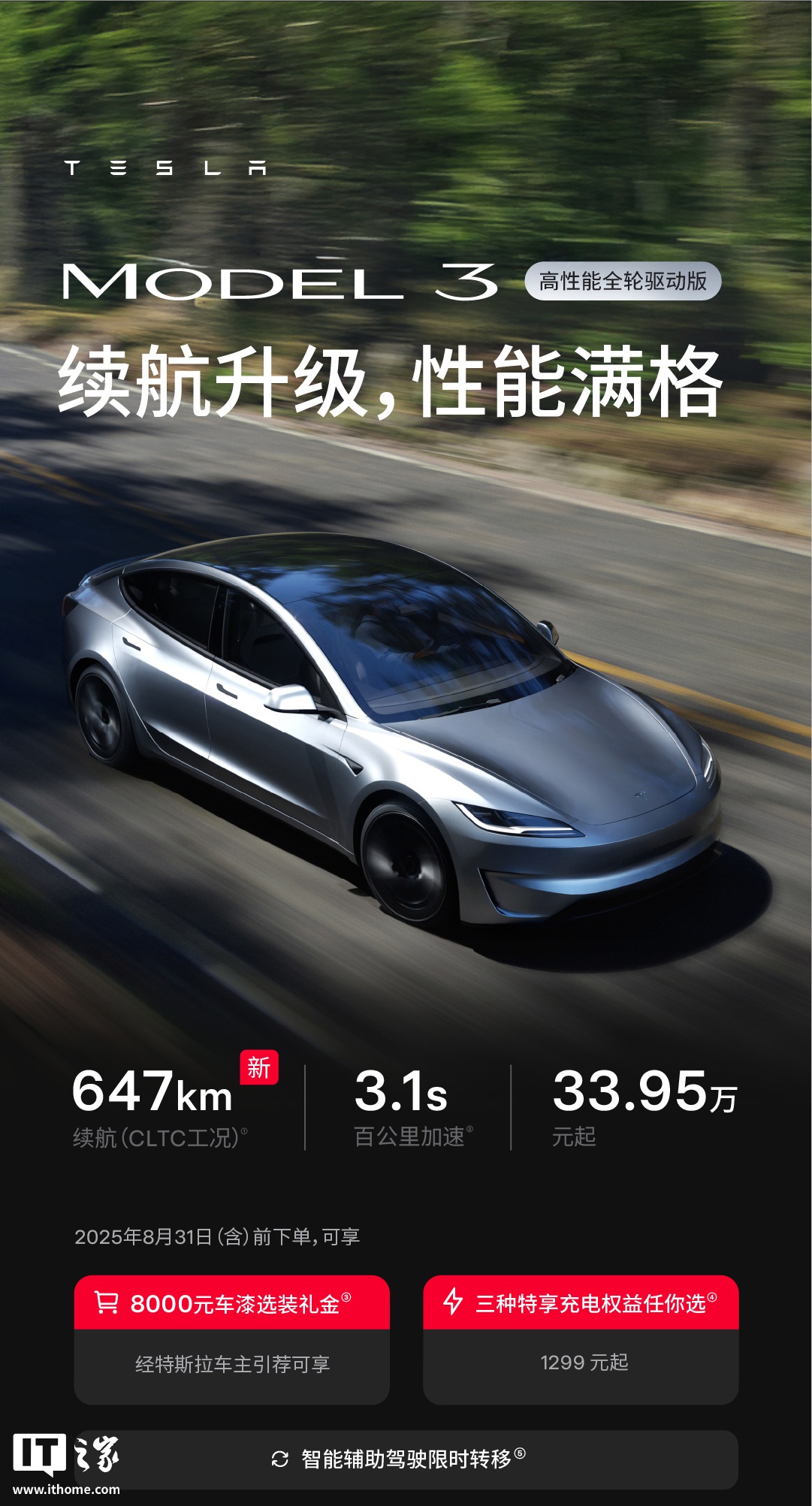 此外,Model 3 的高性能全轮驱动版也迎来升级,CLTC 续航 647 公里(IT之家注:原版为 623 公里),售价 33.95 万元起,价格不变。