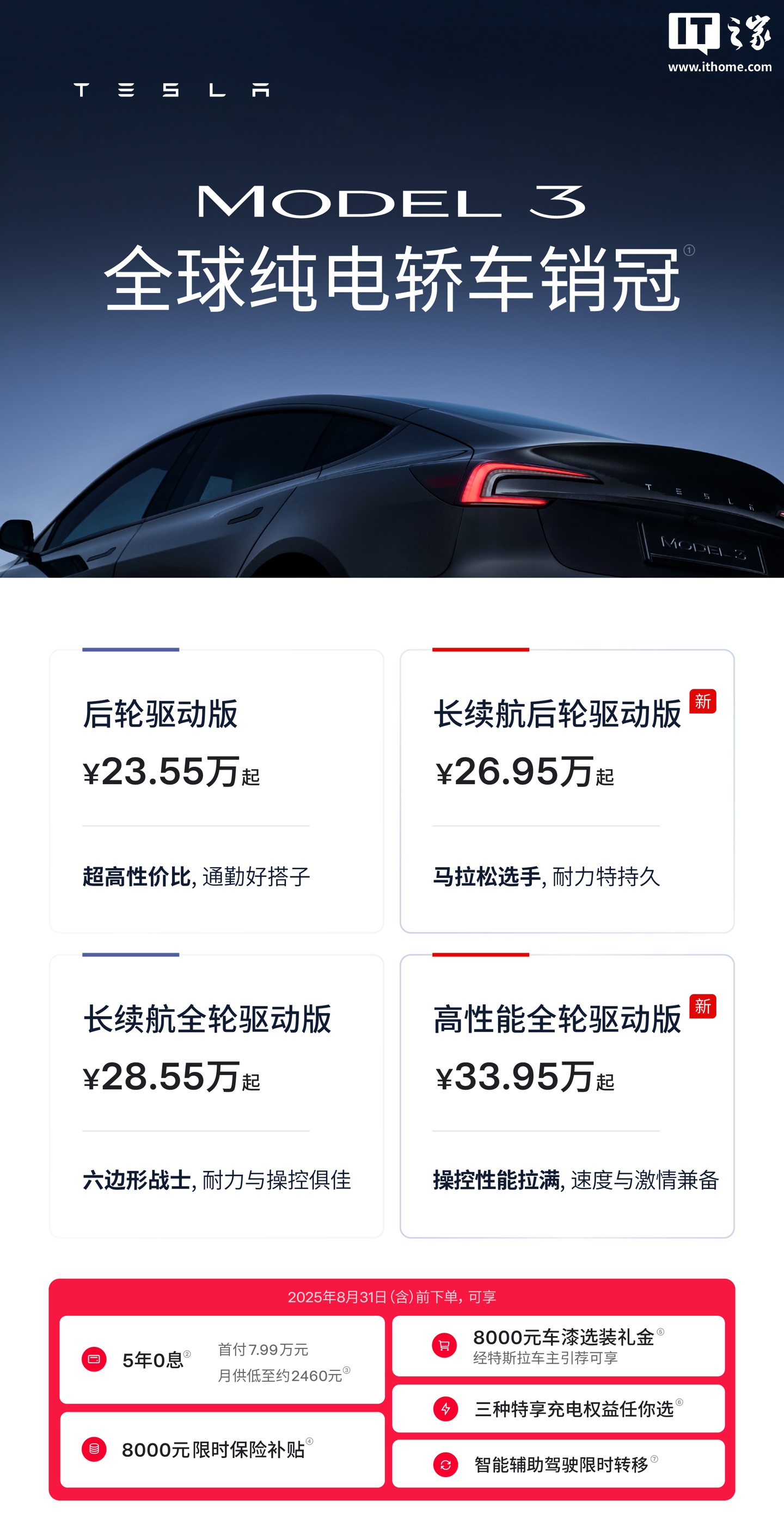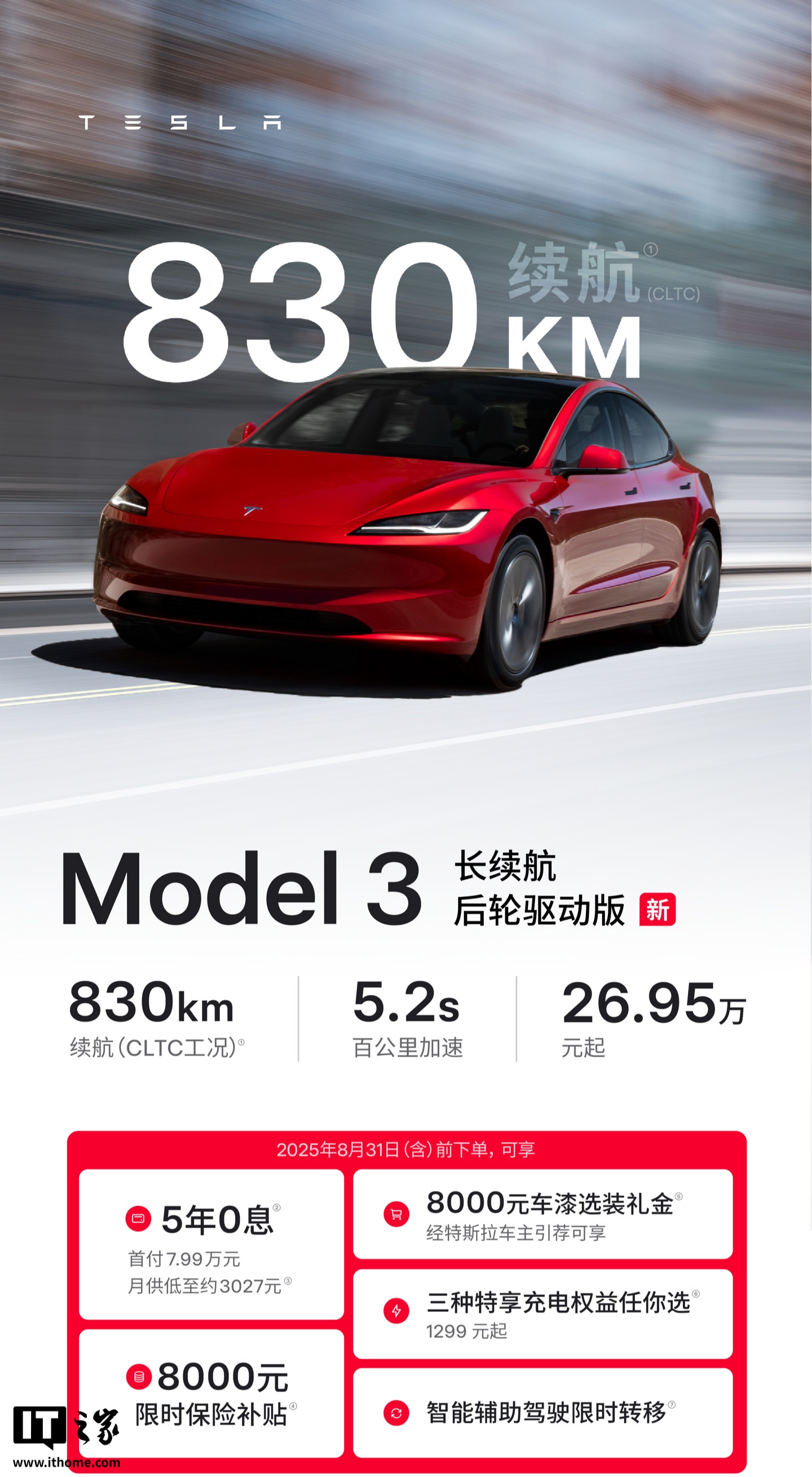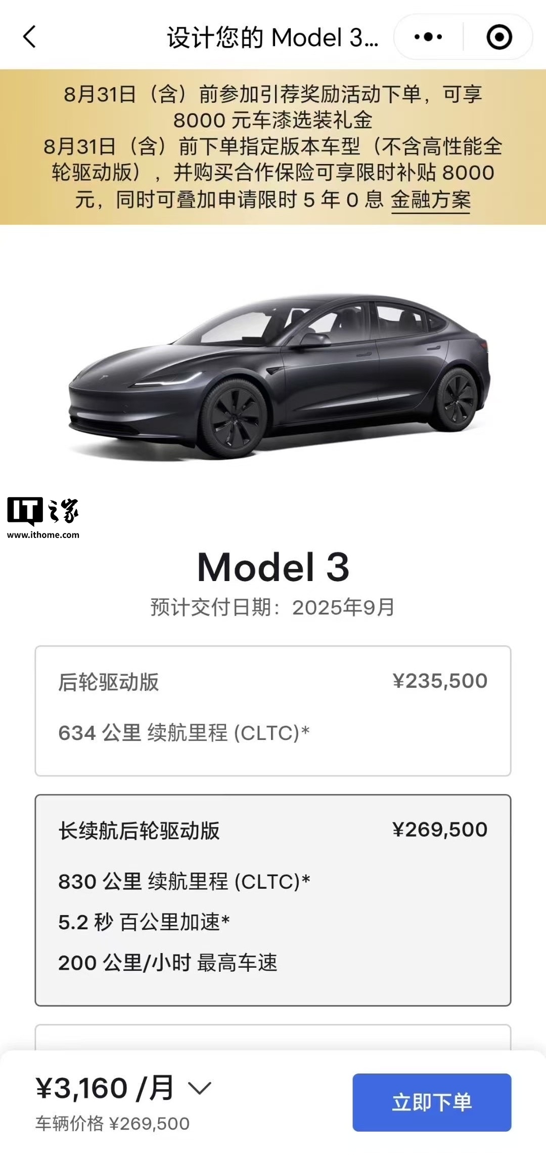 IT之家 8 月 12 日消息,特斯拉今日在官方商城上线了 Model 3 长续航后轮驱动版车型,这是特斯拉当前续航最强的车型,CLTC 续航可达 830 公里。