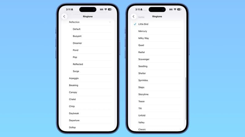 在铃声方面,Reflection 铃声新增多个变体,包括 Buoyant、Dreamer、Tech、Pop、Reflected 和 Surge,丰富了用户选择,其中 Reflected 为此前 Beta 2 时引入的“Alt 1”版本,此外还增加了名为 Little Bird 的新铃声。