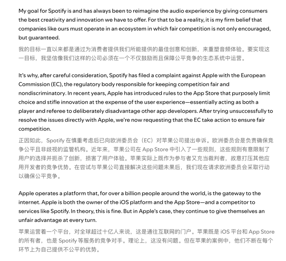 但针对“苹果税”的调查展开得更早。2015 年,全球最大的流媒体音乐巨头 Spotify 就开始向欧盟委员会控诉苹果不正当竞争,反对苹果高达 30% 的抽成比例,并在 2019 年正式向欧盟委员会递交诉状。Spotify 创始人 Daniel Ek 多年来不断抨击苹果存在不正当竞争行为,称苹果既当裁判员又当运动员,故意挤压其他应用开发者。
