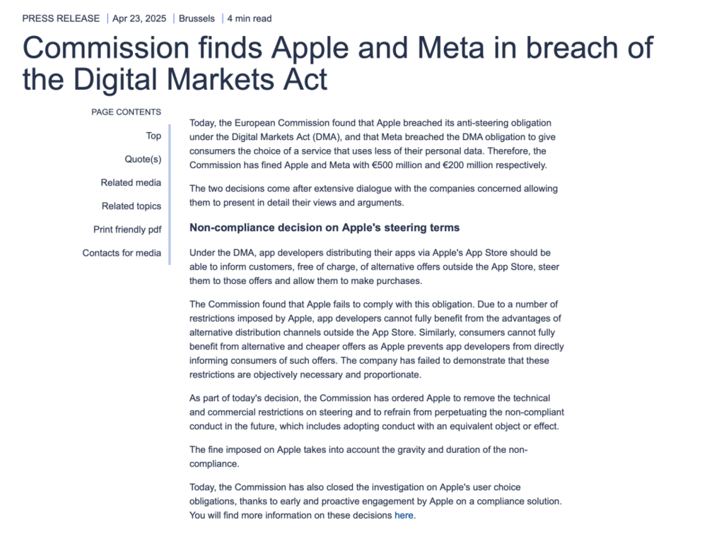但在欧盟委员会看来,苹果的这些措施仍有碍公平竞争原则。今年 4 月,欧盟再度对苹果处以 5 亿欧元的罚款,理由是苹果违反了 DMA 法案中的“反引导义务”。这是 DMA 法案下开出的首份罚单。