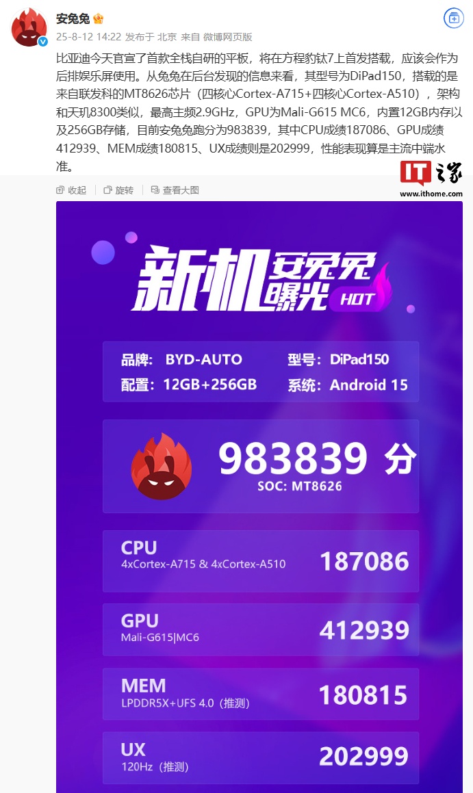 IT之家注意到,安兔兔官方今日发文称,其后台信息显示比亚迪首款全栈自研平板型号为 DiPad150,搭载联发科 MT8626 芯片(四核心 Cortex-A715 + 四核心 Cortex-A510),架构和天玑 8300 类似,最高主频 2.9GHz,GPU 为 Mali-G615 MC6。