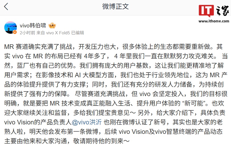 MR 赛道确实充满了挑战,开发压力也大,很多体验上的生态都需要重新做。其实 vivo 在 MR 的布局已经有 4 年多了,4 年里我们一直在默默努力攻克难关。当然,蓝厂也有自己的优势。我们拥有庞大的用户基数,这让我们能更精准地了解用户需求;在影像技术和 AI 大模型方面,我们也处于行业领先地位,这为 MR 产品的体验提升提供了有力支撑;同时,我们还有充分的研发人力储备,为持续创新提供了强有力的保障。尽管赛道充满挑战,但 vivo 会坚定投入,我们的目标很明确,就是要把 MR 技术变成真正能融入生活、提升用户体验的“新可能”。也欢迎大家继续关注和监督,多给我们提宝贵意见~