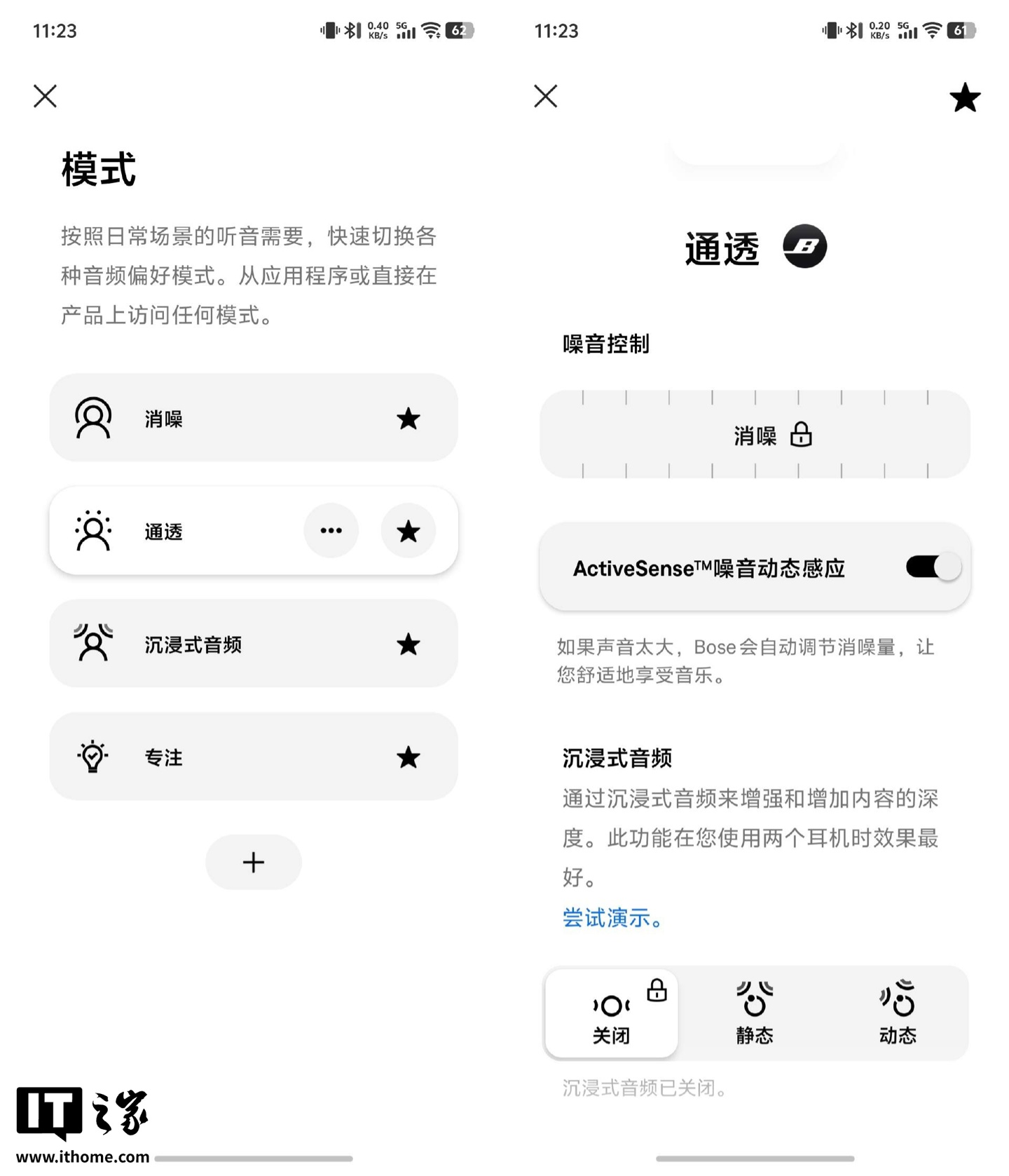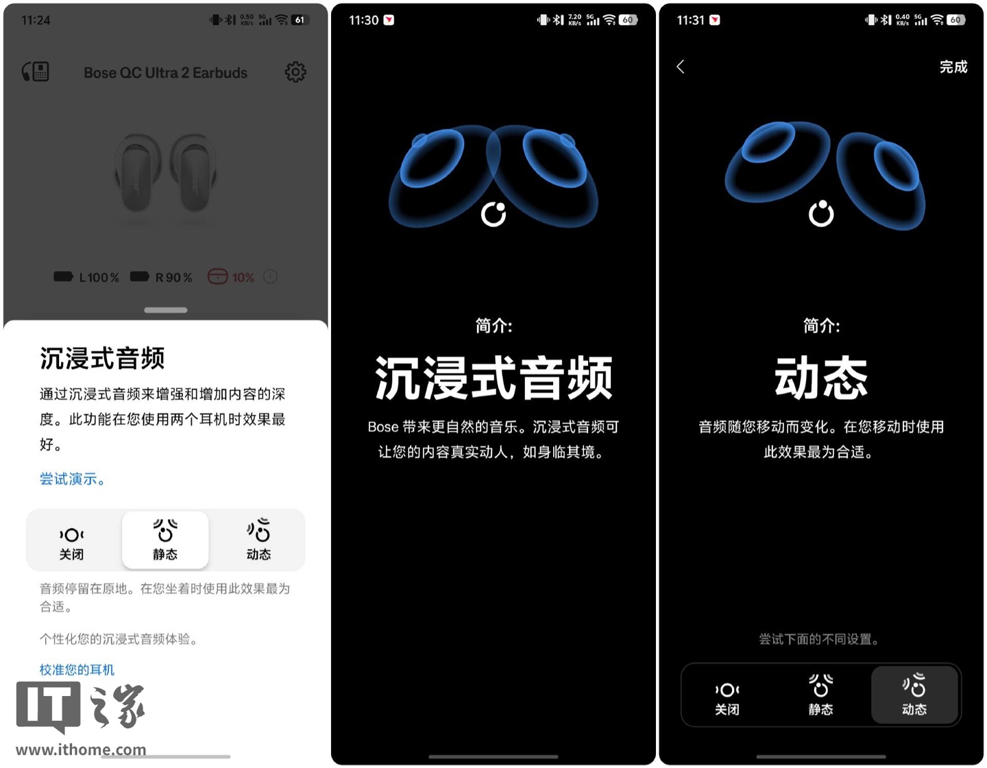 Bose QC Ultra II 的沉浸式音频倒是很令人惊喜,其提供了“静态”、“运动”两个选项。前者适适合坐着时使用,开启后,转动头部,音源始终保持同一位置上;“运动”则是让声场空间始终围绕着头部,更适合移动时开启。