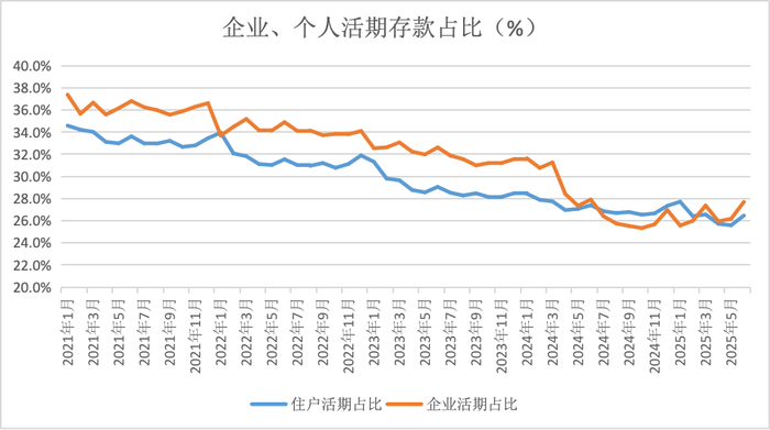 从企业、居民活期存款占比情况看,居民活期存款占比仍然处于下降的通道。这可能意味着虽然居民活期存款有所增加,但居民定期存款以同比例或更高比例增加。