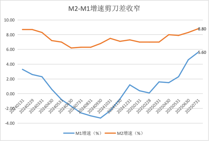随着M1增速持续回升、M2增速保持在8%左右,7月份M2与M1的同比增速“剪刀差”收窄至3.2个百分点,显示资金活化程度有所提升。