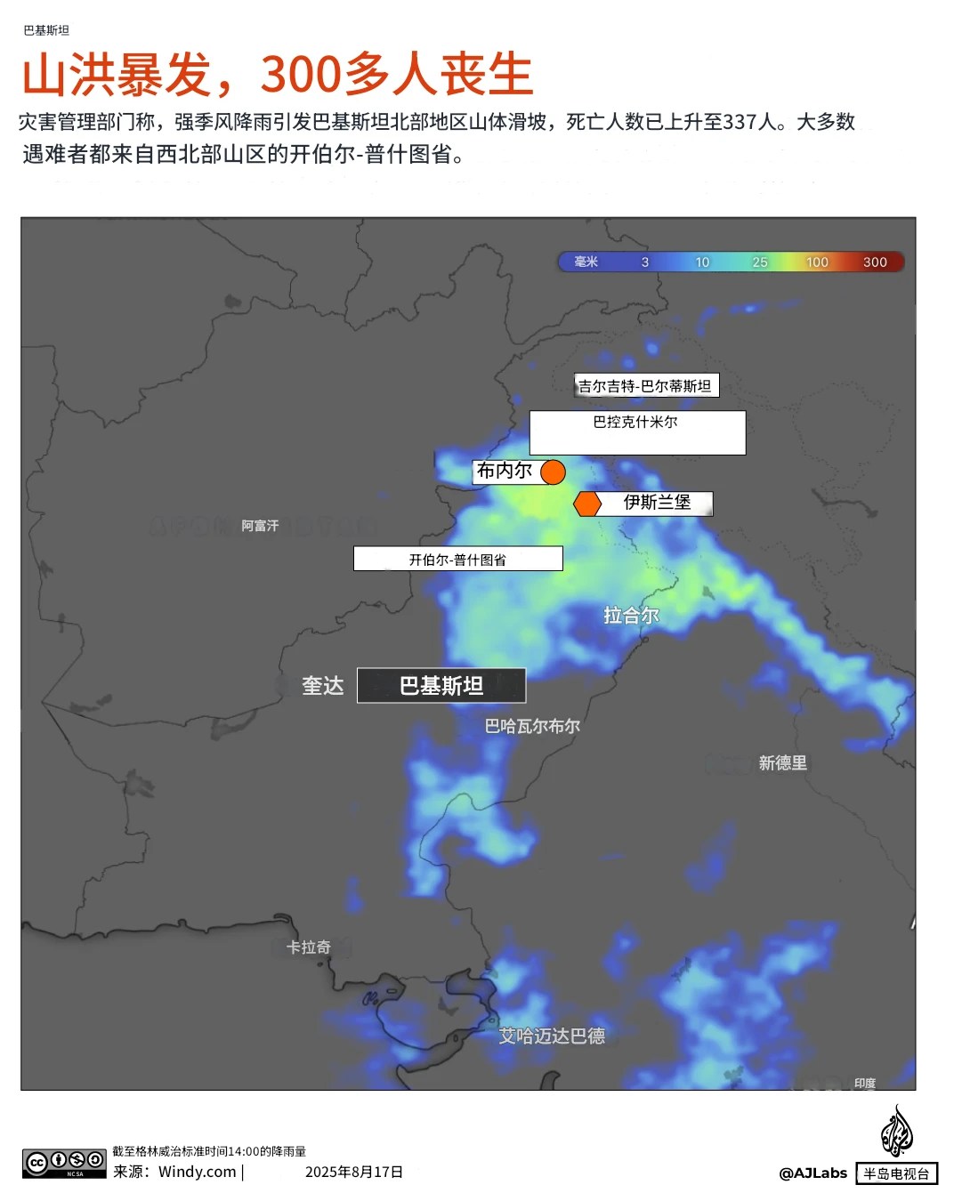 据国家灾害管理局称,气候变化引发的山洪已在巴基斯坦西北部造成至少337人死亡,另有数十人在该地区近日遭受山洪袭击后失踪。