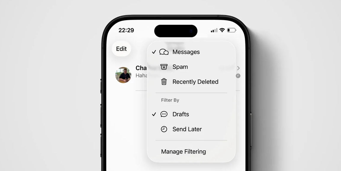 除了草稿功能,iOS 26 的过滤菜单还包括了常用的“消息”、“垃圾信息”和“最近删除”等选项。更智能的是,菜单会根据用户的实际情况,动态显示“未读消息”或“计划发送”等筛选项。