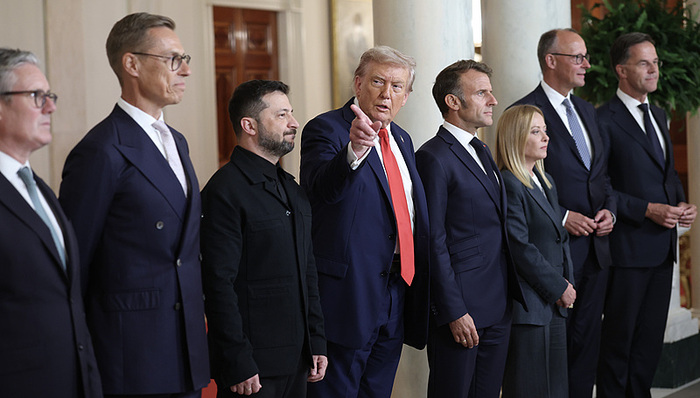从左至右依次为:英国首相斯塔默、芬兰总斯图布、乌克兰总统泽连斯基、美国总统特朗普、法国总统马克龙、意大利总理梅洛尼、德国总理默茨和北约秘书长吕特。来源:视觉中国