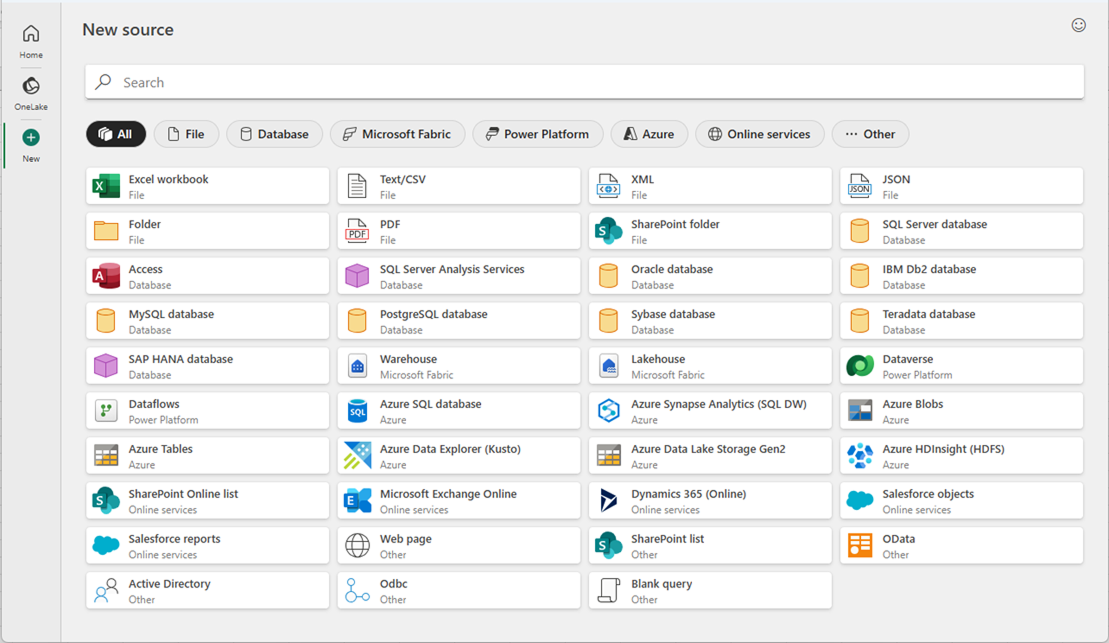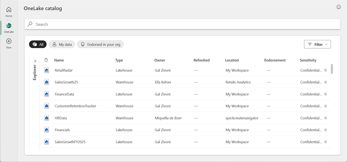 用户可以通过同一导航面板中的 OneLake 按钮,访问 Fabric 平台上的 OneLake 数据实体。新版还有一个方便的搜索栏功能,这意味着用户无需滚动看似无尽的数据源列表来找到所需内容。