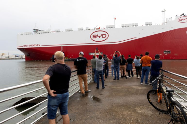 比亚迪的一艘船停靠在巴西圣卡塔琳娜州的港口,民众在此拍照记录这家中国巨头的存在 (路透)