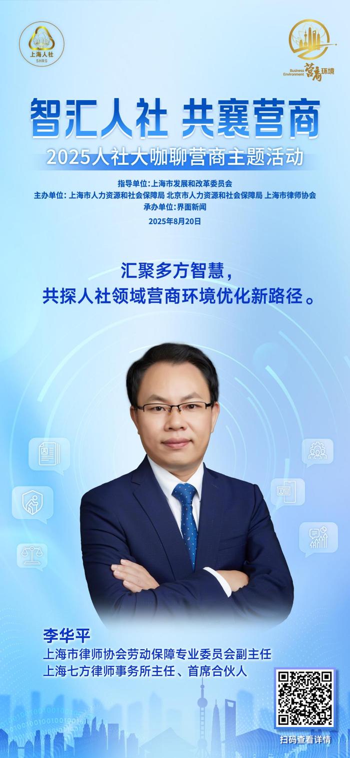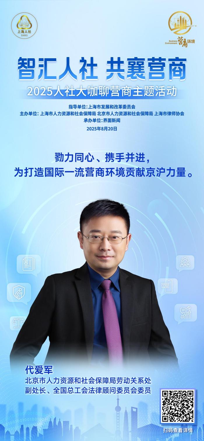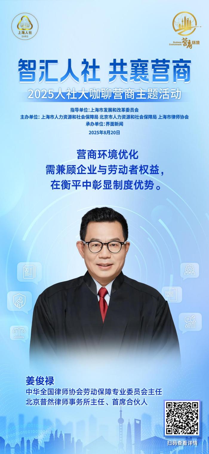 聚焦人社领域创新实践,8月20日上午,“智汇人社 共襄营商”人社大咖聊营商主题活动成功举行。本次活动由上海市发展和改革委员会指导,上海市人力资源和社会保障局、北京市人力资源和社会保障局、上海市律师协会共同主办,界面新闻承办。活动邀请了行业协会代表、企业高管、高校学者、知名律师等来自各领域的大咖嘉宾,以主旨演讲与圆桌讨论的方式深入交流,为破解领域内营商环境痛点贡献专业智慧。