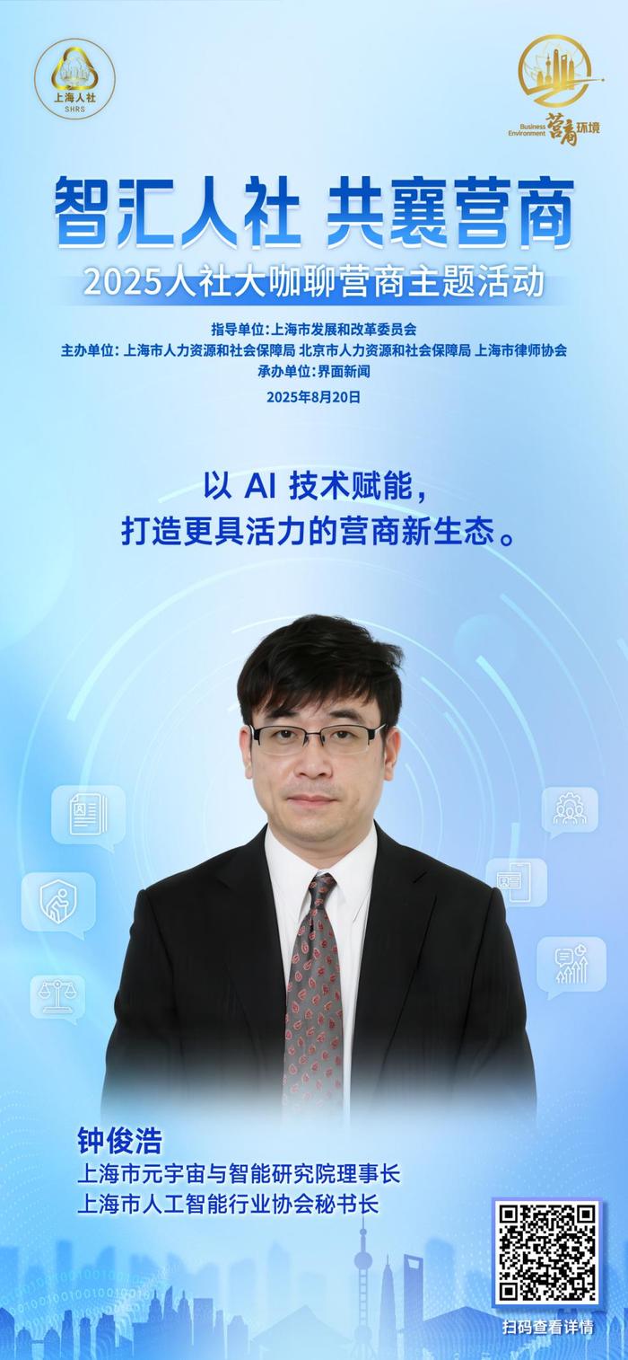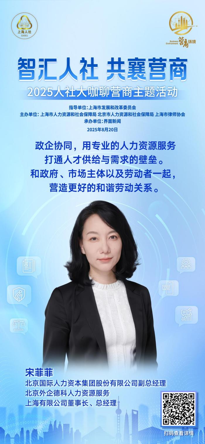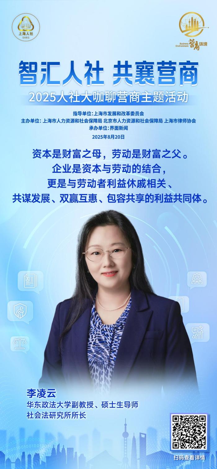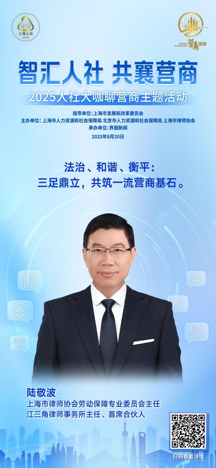 聚焦人社领域创新实践,8月20日上午,“智汇人社 共襄营商”人社大咖聊营商主题活动成功举行。本次活动由上海市发展和改革委员会指导,上海市人力资源和社会保障局、北京市人力资源和社会保障局、上海市律师协会共同主办,界面新闻承办。活动邀请了行业协会代表、企业高管、高校学者、知名律师等来自各领域的大咖嘉宾,以主旨演讲与圆桌讨论的方式深入交流,为破解领域内营商环境痛点贡献专业智慧。