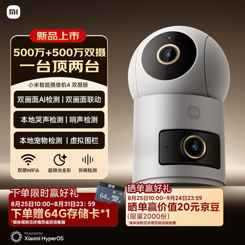 IT之家 8 月 25 日消息,小米智能摄像机 4 双摄版今日开售,双镜头升级 500 万像素,拥有 3K 画质体验,支持双摄人 / 宠联动追踪、多类型 AI 看护功能,售价 299 元,首发赠 64GB 存储卡。