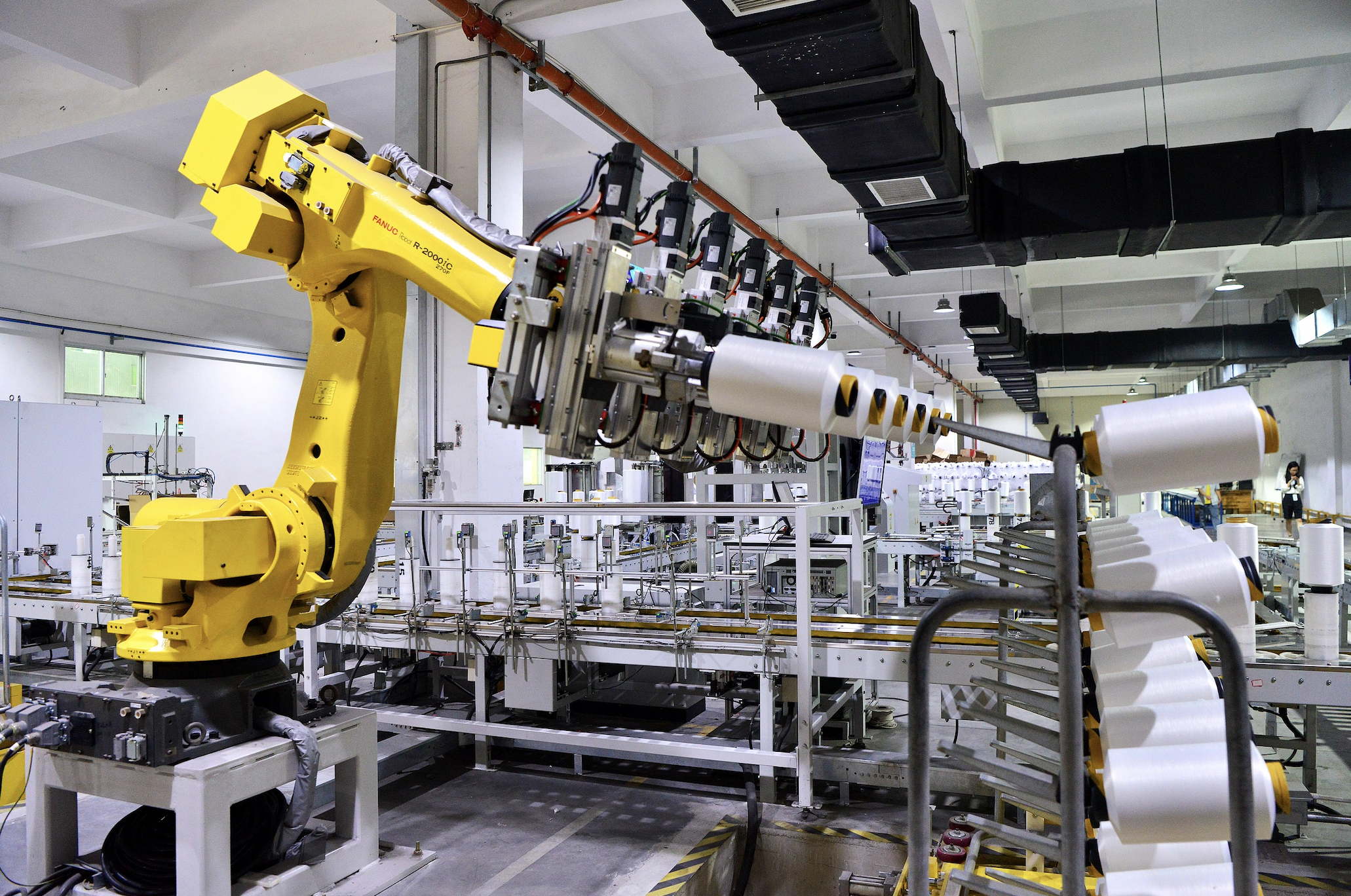 2023年5月31日,福州市,长乐区一家化纤纺织企业智能车间内,机器人在生产线上作业。图片来源:CFP