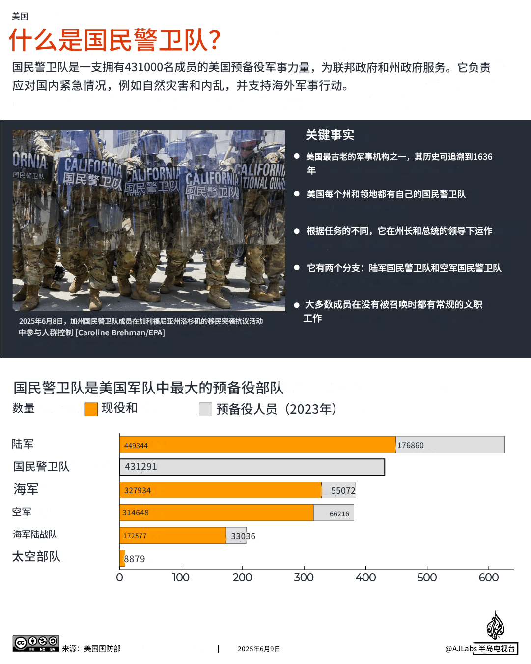 国民警卫队由陆军国民警卫队和空军国民警卫队组成,总人数约43.1万,是美国军队中规模第二大的分支。