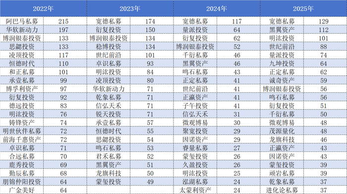 界面新闻根据Wind数据梳理了2019年以来各年度备案产品数量排名前20位的私募管理人榜单(2025年按照截至8月24日的数据统计),量化私募中仅明汯投资连续7年持续上榜,衍复投资连续6年上榜,其余量化私募7年内的上榜次数均在4次及以下。