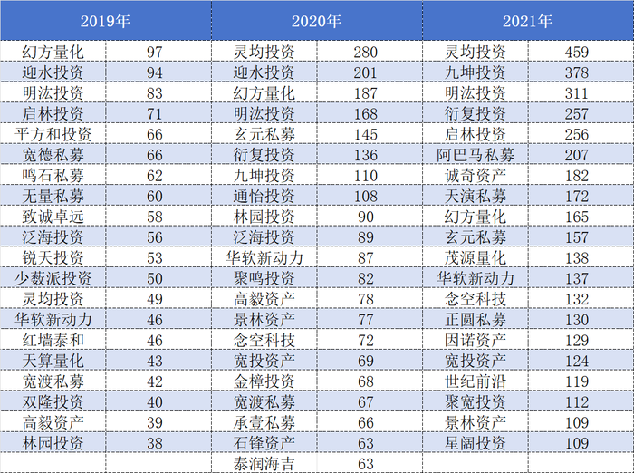 回过头来看,2019年备案数量居前的量化私募中,有8家目前管理规模超过100亿元,2家管理规模为50-100亿元。