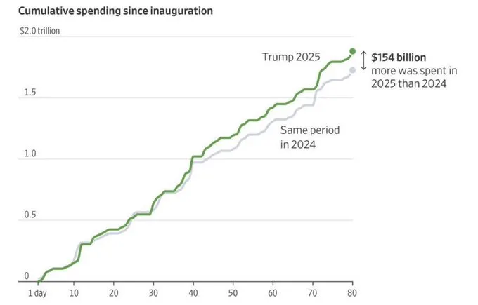 更可怕的是,2025年特朗普就职80天之后美国的政府开支,甚至还要高于去年同期1540亿美元。