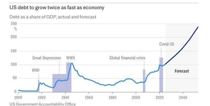 美元世界体系成立的一个重要前提是美联储负责任的货币政策,使得全球投资者认可美元的低通胀和安全性。然而老生常谈的美国国债问题当前已经极其危险。随着2008金融危机和2020疫情的两次超级放水,美国国债占经济总量的比重已经超过了122%,也超过了二战时的顶峰。