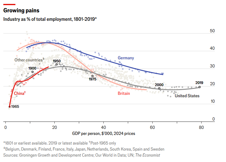 各国历史上人均GDP和制造业就业人数比例之间的关系