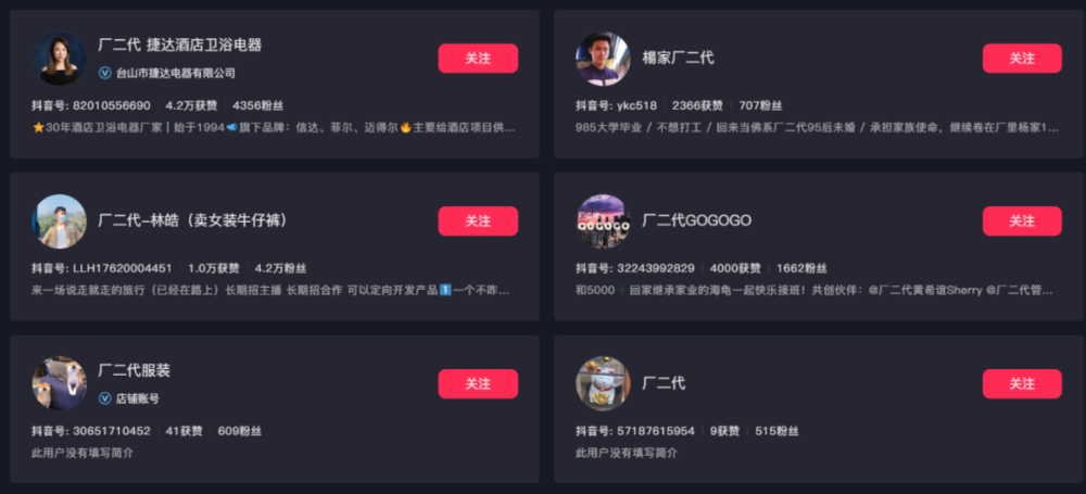 小红书上,大部分的厂二代账号粉丝只有两三位数,发布的作品只有个位数。抖音上的账户,更多也只是少数人成功,大部分厂二代都在浅尝辄止之后,继续湮没在网络的浩瀚海洋中。