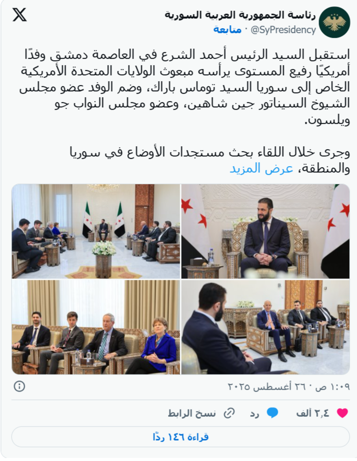 在这个高度敏感的政治时刻,一个美国高级代表团访问了这两个国家的首都,传递了双重信息。上周一,代表团在大马士革总统府会见了叙利亚总统艾哈迈德·沙拉。代表团成员包括美国特使汤姆·巴拉克、参议员珍妮·沙欣和众议员乔·威尔逊。他们讨论了叙利亚及该地区的最新局势,并探讨了加强对话与合作的途径。