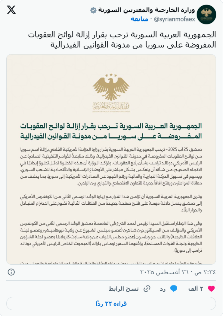 此次会晤恰逢美国财政部宣布将从联邦法律中删除对叙利亚的制裁规定。该决定将于同日生效,大马士革官方对此表示欢迎。