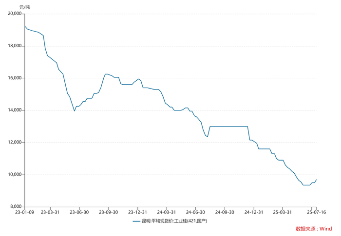 更致命的是上游原料工业硅价格的断崖式下跌。据Wind数据,昆明工业硅(421#)现货均价从2023年底的1.59万元/吨一路暴跌至2024年底的1.22万元/吨,全年跌幅达23%。进入2025年,颓势未止,价格如自由落体般下坠,至6月底已跌至9350元/吨,年内再挫23%。这意味着在短短一年半内,工业硅价格已遭“腰斩”。