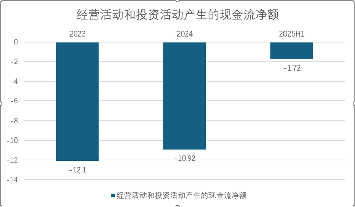 更令人忧心的是新安股份持续恶化的现金流。2023年至2025年上半年,公司经营活动及投资活动产生的现金流量净额持续为负,分别为-12.1亿元、-10.92亿元和-1.72亿元,公司主业造血功能薄弱且投资支出巨大,对外部融资依赖极强。