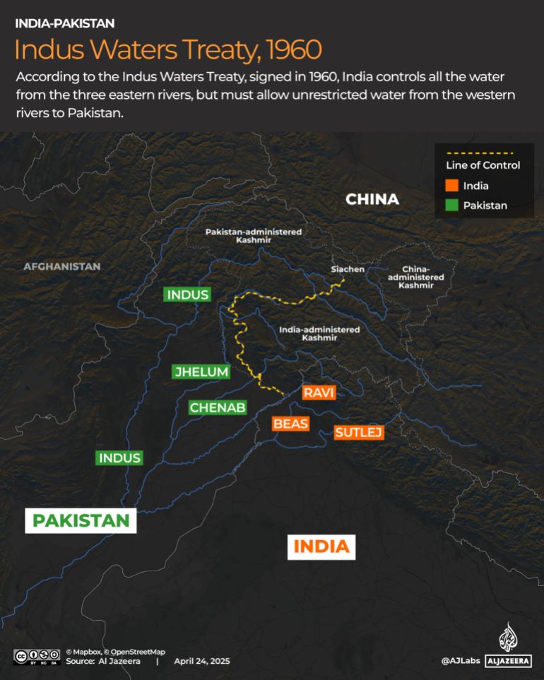 根据1960年签署的《印度河流域水资源条约》,印度控制着东部3条河流的所有水量,但必须允许西部河流的水量不受限制地流向巴基斯坦 (半岛电视台)