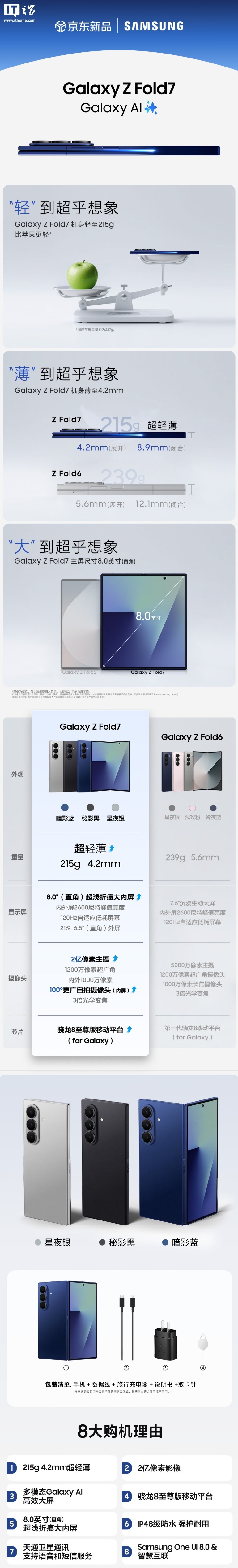 IT之家注意到,相比上一代 Z Fold6,三星 Galaxy Z Fold7 在展开厚度上从 5.6mm 降到了 4.2mm,机身重量也从 239g 降到了 215g,成为目前全球最轻的大折叠手机。
