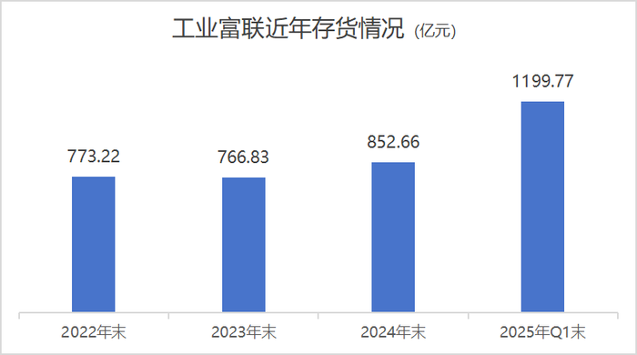 截至2023年末,工业富联存货为766.83亿元,2024年末为852.66亿元,一年才上升不到90亿元。但到2025年一季度末,公司存货大幅上升至1,199.77亿元,较上年末增加347.11亿元,增幅超过40%。