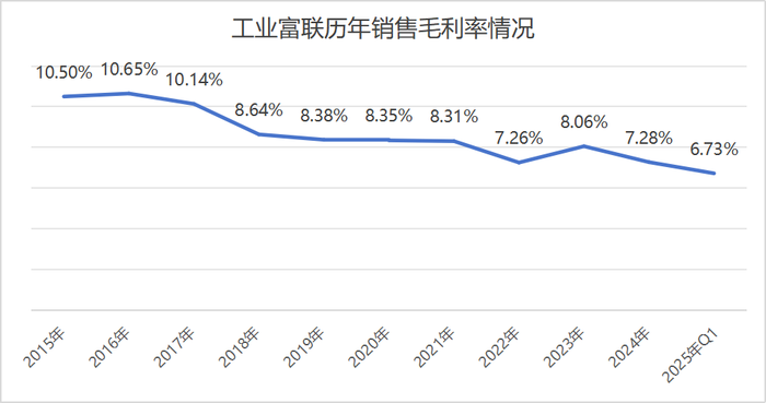 在营收规模不断扩大的同时,工业富联也面临着激烈竞争,销售毛利率逐年下滑趋势十分明显。