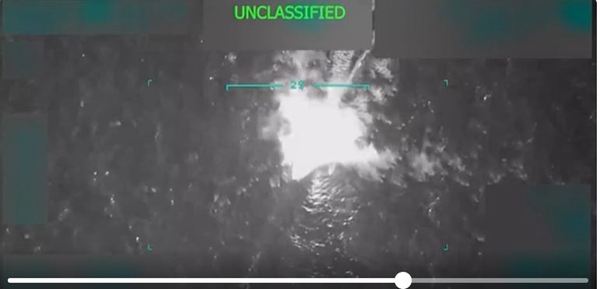 特朗普还在贴文后附上一段黑白视频,视频显示一艘小船在海上快速行驶,随后爆炸起火。从视频中无法辨认船上是否有11人,也无法确定船上是否装有毒品。