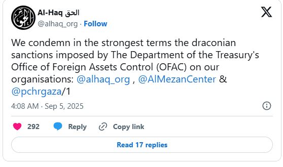 制裁法律专家、民主阿拉伯世界委员会(DAWN)顾问莫森·法什内沙尼在社交平台X上发文称,这些组织是”巴勒斯坦最杰出的人权团体”。
