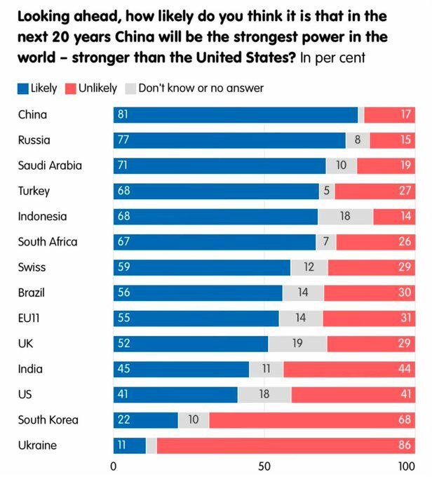 不过顺便说句公道话,美国人在对华认知上已经算不那么离谱的,最离谱的是那些美国的傀儡国。比如今年刚好有一个针对各国的民意调查,问二十年后中国是否会在实力上超过美国: