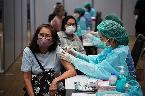 新冠疫情期间,卫生工作者在曼谷购物中心的疫苗接种现场为人们接种新冠疫苗。 视觉中国