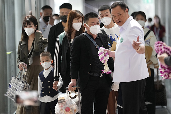 2023年1月9日,时任泰国公共卫生部长阿努廷在素万那普国际机场向中国游客发放花环。 视觉中国