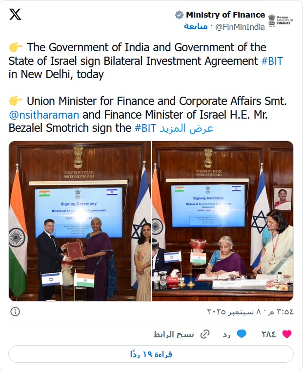 印度财政部长尼尔玛拉·西塔拉曼与以色列财政部长斯莫特里奇共同出席并签署文件,旨在加强两国的投资与经济合作。