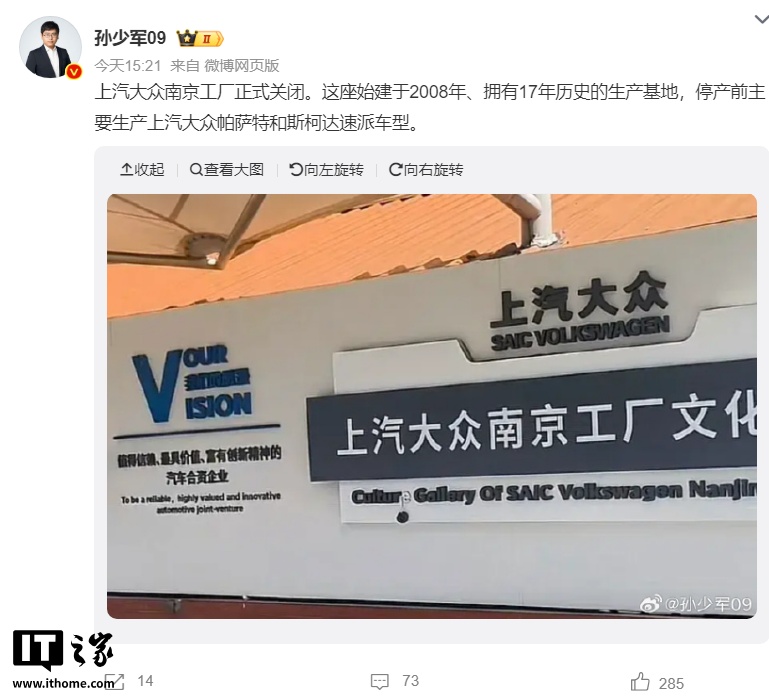 IT之家 7 月 10 日消息,博主 @孙少军 09 今日发文,上汽大众南京工厂正式关闭。这座始建于 2008 年、拥有 17 年历史的生产基地,停产前主要生产上汽大众帕萨特和斯柯达速派车型。